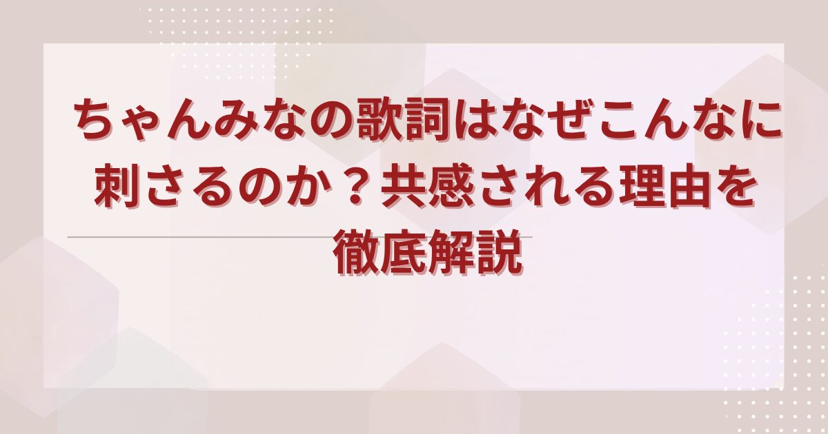 こんにちは! 今日は、日本のヒップホップシーンを代表するアーティスト、ちゃんみなさんの歌詞の魅力に迫ってみます。彼女の楽曲は、聴く人の心をグサッと刺すようなリアルさと感情の深さが特徴で、特に若者を中心に共感を呼んでいます。なぜそんなに刺さるのか? プロフィールから具体的な歌詞考察、ファンエピソードまで、徹底的に掘り下げてみましょう。最新ニュースも交えて、彼女の魅力を再発見してください!