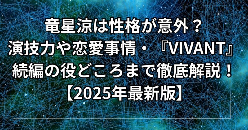 俳優・竜星涼さんの性格や演技力、恋愛事情を徹底解説。2026年秋ドラマ『VIVANT』続編での新庄浩太郎役にも注目。誠実で天然な素顔と俳優としての魅力を紹介します。